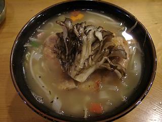 ただ、刻みピッキーヌ3本は結構な辛さ。実際には自分で辛さを加えるように調整するかもとのこと。チキンとマイタケがメーン具です。