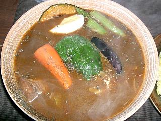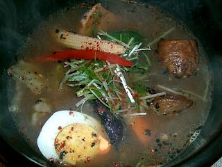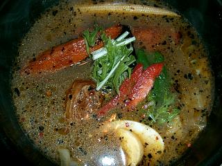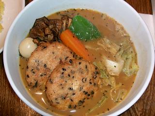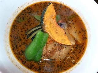 カレーのほかにスープとサラダ(じゃがいもと麦)付。スープカレーとのことだが、「本格的インドカリー+流行の具」という印象。かなりスパイシーで、辛さに弱い人にはキビシイかも。お店でも辛過ぎるという意見があるそうだ。