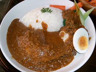 スープカレーの一般的な具(チキンレッグとか)にルーカレーを合わせたメニュー。ルーは挽肉入りキーマ。