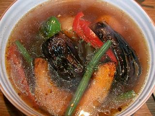 今週から出し始めたという新作スープ。こってり系かと思いきや、これまでのスープで一番近いのは開闢だろう。なかなかウマーなスープですよん。具では、なすとパプリカとズッキーニを細かく炒めたものが入っているのが特徴的。