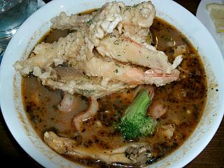 ランチ50円引+クーポンのトッピングサービスで非常にお得感のある一杯。トッピングで選んだベーコンもちょっぴりでは無く、ドサッと入ってる感じ。まぁ、スープは特にどうと言うことも無いのだが、沢山の具を美味しくいただけるのが高ポイントだね。ただ本日はえび天に臭みが。油が古くなるとペンキのような臭いがするというが・・・ここは具がポイントの店だから、こういうところこそしっかりと気を配って欲しい。今まではそんなこと無かったのでタマタマであると信じたいが・・・。