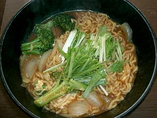 玉ねぎ、ブロッコリと玉子を加えて、水菜をトッピング。それっぽくしてみたけど、やっばりタダのカレーラーメンだな(笑)
