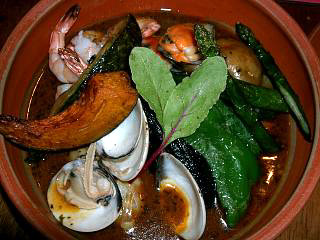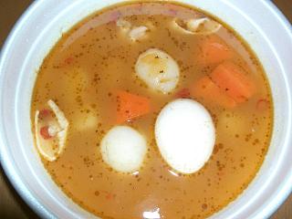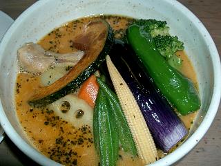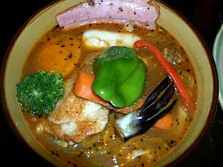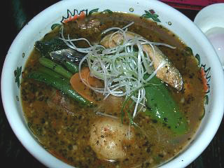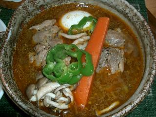 濃い目のブイヨンにスパイスを合わせた流行のタイプ。本店で食べたときは大蒜が効いてる感じだったが、今日のは随分印象が違った。これと言った特徴無く、印象に残るスープじゃないなぁ。具は、総じてカタく食べにくい。ピーマンはほとんど「生」な感じ。チキンは肉の骨離れ悪い。ただマッシュされたイモだけが妙に食べ易かった。トッピングサービスのベーコンが思ったより大きくて良心的だったので、オマケして☆アップ。