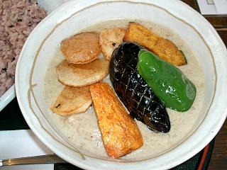 チキンのタイカレーにスープカレー風の素揚げ野菜を加えたもの。タイカレーとしてフツーに美味しい。ただ、「スープ状の」と言ってるほどシャバシャバではなく、ライスにかけて食べる方が合うようだ。ライスは黒米。カレーが1種類しかないのが残念だね。