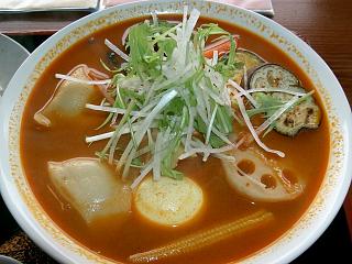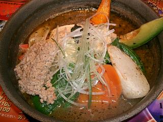 野菜+月替りのトッピングってのがここでいただくときのmy定番。野菜では、パッと見、火を通し過ぎにも感じるカリカリのブロッコリが特にお気に入り。今月のトッピングは野菜かきあげだったので、これぞ「野菜&野菜」ですな。