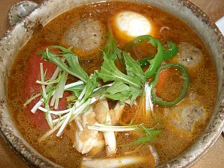 何度も前を通りながらも、いつも「準備中」で正直あぼーんかと思っていたが、ついに本日「営業中」に遭遇。スープの味は所謂カレーっぽいタイプだが、結構ストレートな辛さで下から3番目のこれだと、辛さに弱い人にはキツイかも。メーン具は「煮込み」と謳ってるだけあり、しっかりと味の付いた柔らかなチキン。辛いスープに負けないためか、かなり濃い味付けで、これだけでも酒の肴になりそう。スープに一工夫あると面白くなりそうなんだけどな。