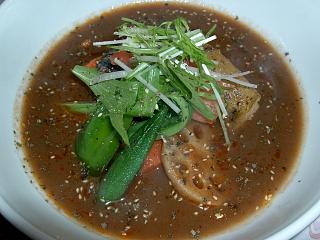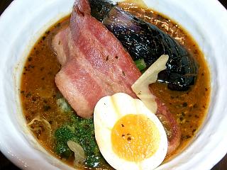 3 種類のスープを持つ店だが、まずは店名を冠された基本スープをいただくことに。あっさり系でスパイス感は弱く、スパイス好きには物足り無いかもしれないが、旨み系スープが好みなら合うと思う。個人的にはもちろん○。具は標準的な仕上げだね。今回はスペシャルベジ950円+ベーコントッピ150円+クーポン割引▲100円でこの価格だけど、通常のベジは750円、チキンは880円で更にクーポン割引が使えるからかなり良心的な価格。器が深いタイプでやや食べにくいのが残念だったなぁ。
