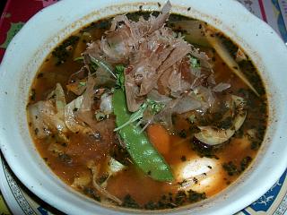 メーン具はスープではなくライス皿の方にON。いつもラマイのを食べているせいか、異様に小さなフライに感じた(笑) スープだけだとベジタブルをいただいているみたい・・・って、揚げ春雨ではなく鰹節がトッピングされてるのが特徴だね。肉系の具がスープに無いと辛さが一段シャープに感じる。個人的にはこのメニューなら天空くらいで良かったかも。