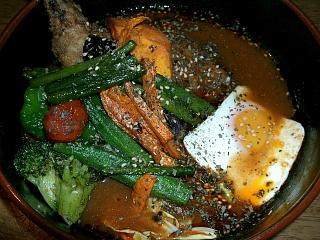お味は「9」とか「ALO ALO」って感じで悪くなかった。チキン(900円)に、いろいろ野菜(200円)をトッピング。ただ、野菜たちは全体的に小ぶりで、スープも少なく、やや高い印象。なお、チキンは他に『煮込み』ってのをチョイス可能。ちなみに右手の四角いのは目玉焼きだ。辛さは結構直球系なので、これ以上はあまり上げない方が良いかもしれない。