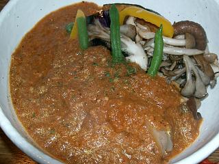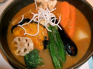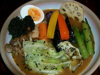 別に注文したイタリアントマトの天ぷら(2個で180円)をトッピングしてみたので、実際よりも豪華になってる・・・ま、それを除いても十分な種類&量の野菜たちで大満足なんだけどね。スープ自体は印象に残らない無難な感じながら、抜群のコストパフォーマンスで、最強の野菜スープカレーの一つと思う。
