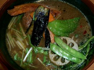 横丁5店目。シャバシャバインドカレー。カシミールは、デリーのではなくアジャンタのそれタイプ。ただ、アジャンタほど甘みが強くないというか、むしろ丁度良い甘さを持っており、コレがなかなかに美味しい。ベースメニュー(850円)だと具がチキンとイモだけっつーのは×。野菜入りを選ぶと、青梗菜・ブロッコリ・人参・ピーマンが加わるが、典型的な札幌スープカレーと比べると、これでも正直寂しい感じ。まぁ、元々旭川の老舗で、カレーも昔からあるタイプなんだから当たり前か。ただ、横丁に来た観光客が「札幌スープ」のつもりでここで食べていくのは、如何なものかと思うなぁ。