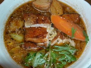 これで横丁全店制覇。この日記で言う「ラーメン系」ってのは、カレーっぽくない塩or醤油ラーメンライクなモノや麺が合いそうなエスニック系スープが多いのだが、ここのはライスが合いそうなのに、ズバリみそラーメンっぽい(笑) 具では名前の通りのパリパリチキンがまさに秀逸。この価格でいただけるならホント文句無し。